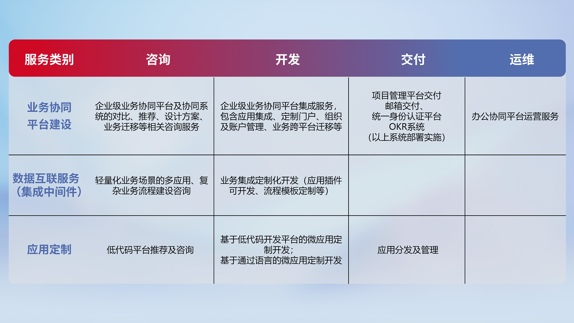 针对钉钉、、、企微、、、、IDaas等平台级产品提供产品的规划、、方案、、交付、、、定制化开发等服务,,,,实现如统一协同办公、、、智能客户服务、、混合会议管理、、、智能数据查询、、等业务场景,,,,实现数字化转型。。。